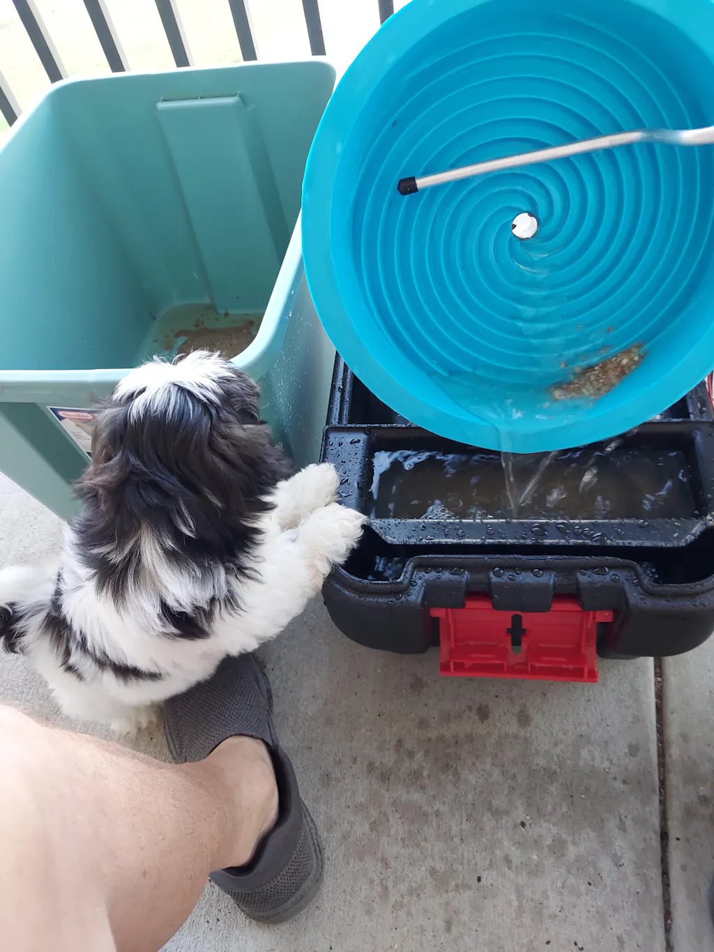 Using the Desert Fox is as easy as it gets. Fill the tank with 3 to 4 gallons of water, hook the clips to your 12-Volt battery, and turn on the switch. As the wheel starts to rotate, water sprays from the spray bar onto the wheel. Simply add a scoop of sand every 20 seconds, and watch the magic happen. The gold settles to the bottom as the spiral turns, and the seven spiral leads pick it up, elevating it to the center hole in the hub where it passes through the hollow shaft into a gold catch cup. Within minutes, you'll be panning like a seasoned expert!
