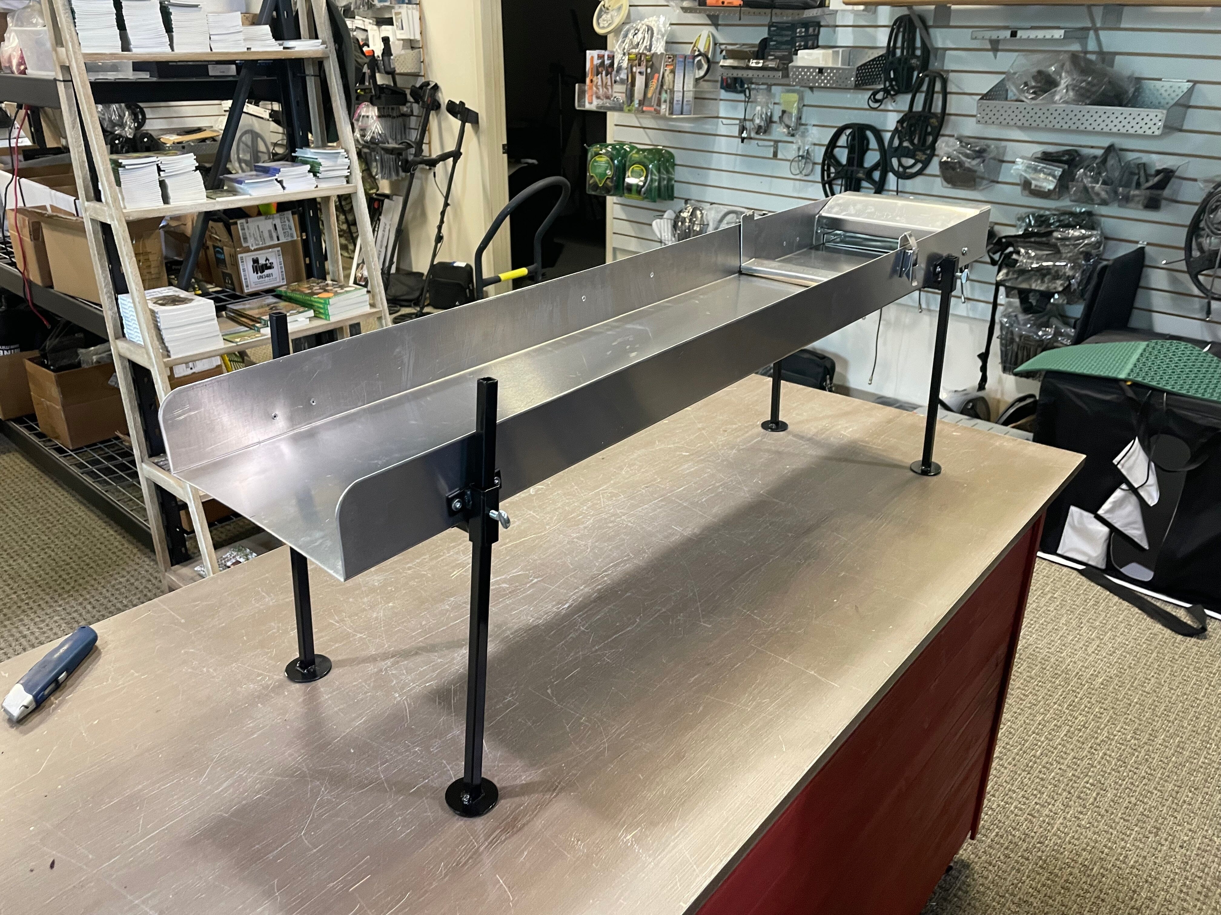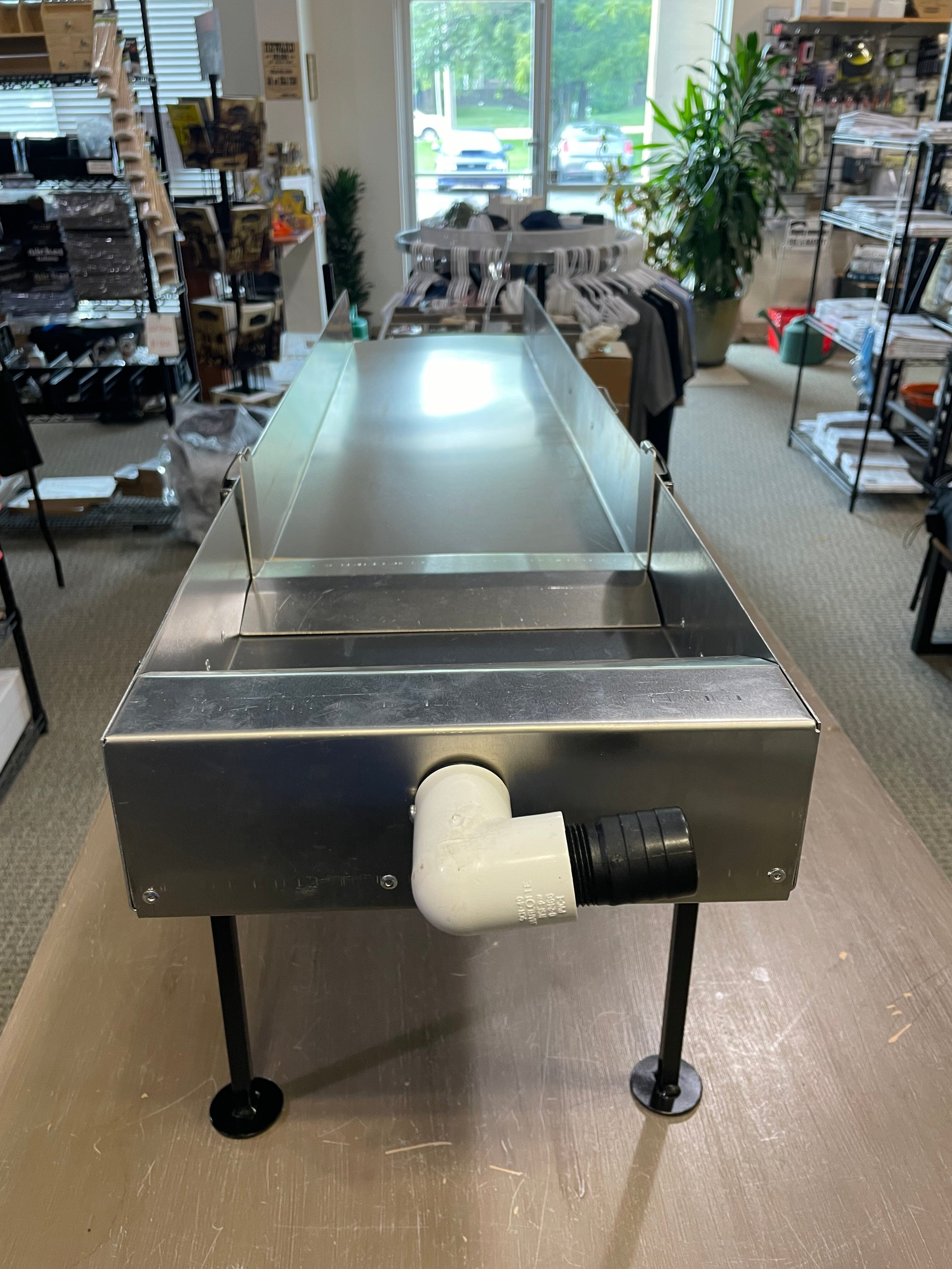 The kit includes a 48"L x 10"W sluice , attached leg brackets with 14" stand legs, a 12 volt 1100-gph pump , 6ft of 1 1/8" hose and a flare that can be used with a flare for in-stream use. Power sluice header box setup and the 1100-gph 12-volt pump all adds up to a good Hi-volume power sluice. It can also be used with a recovery tub to complete a power sluice recirculating system. This kit is made to be used as a stream sluice or a high banker.