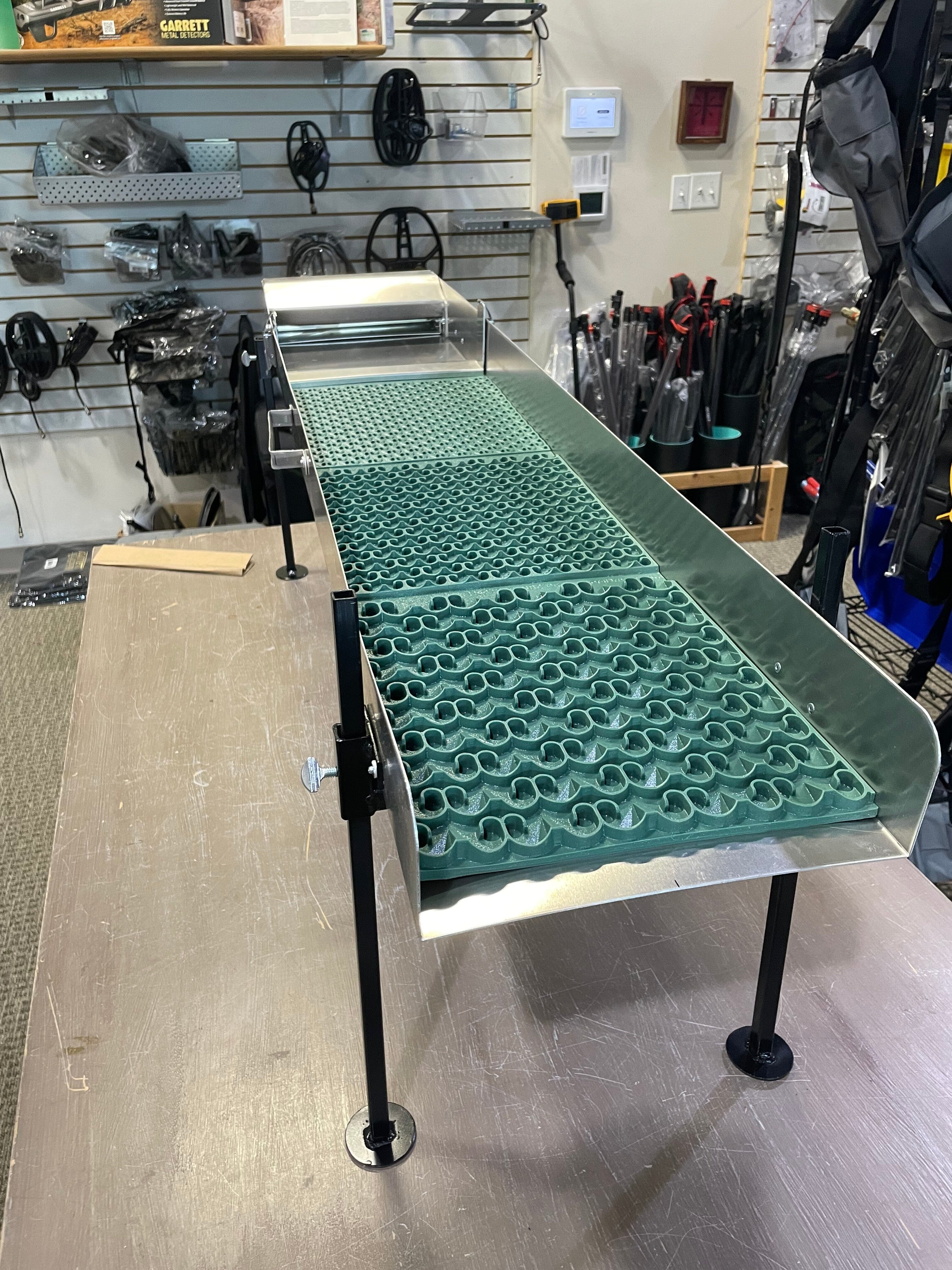 This prospecting set up is made to fit with 3rd-party mats like the Prospectors Dream Mat Vortex Mats with a built in clamp to hold down the mat near the header box.