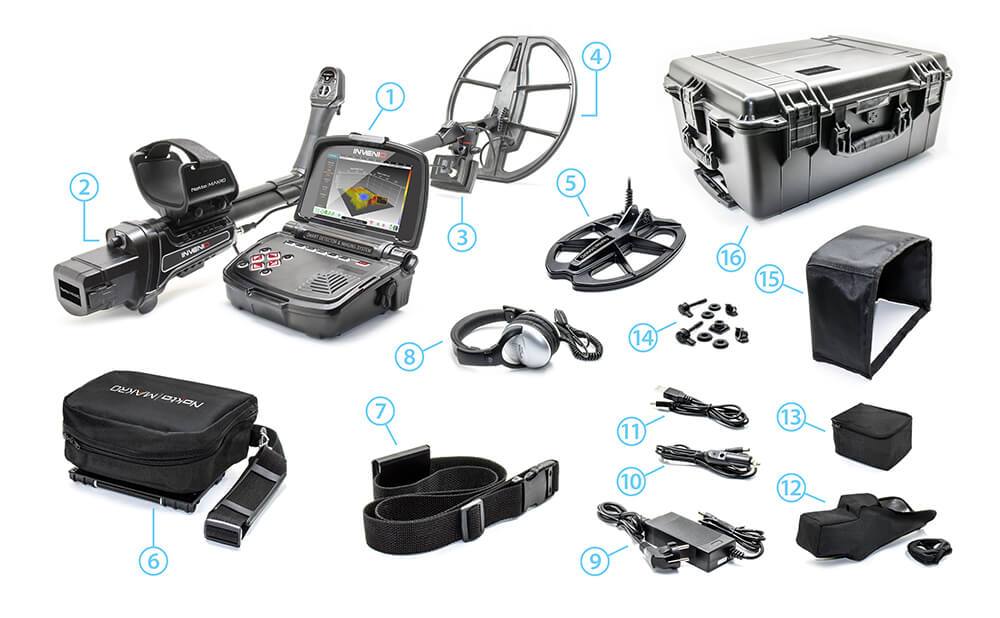 The Invenio Standard Pack model operates at a frequency of 14 kHz. Two waterproof search coils included are the INV28 11" x 7" and INV40 15.5" x 14".