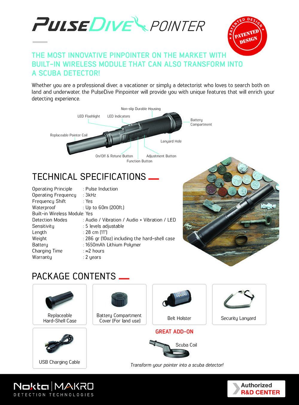 Whether you are a professional diver, a vacationer or simply a detectorist who loves to search both on land and underwater, theĀ PulseDive PinpointerĀ will provide you with unique features that will enrich your detecting experience.Ā